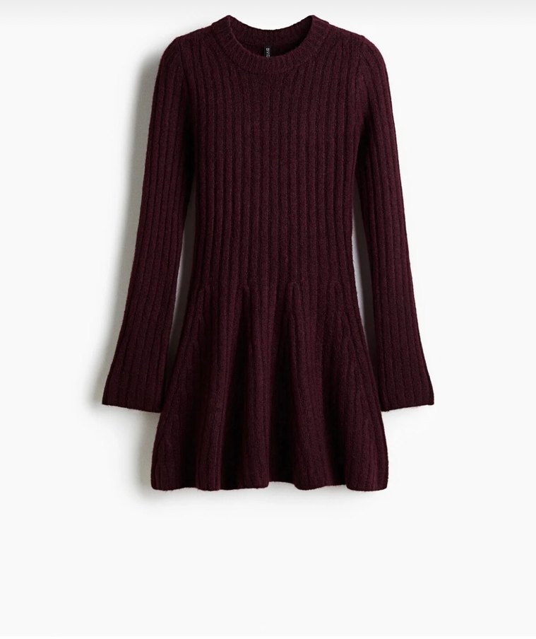 Bordo renkli, yün dokulu, uzun kollu, bisiklet yaka, triko midi elbise, rahat ve modern bir stil sunar.