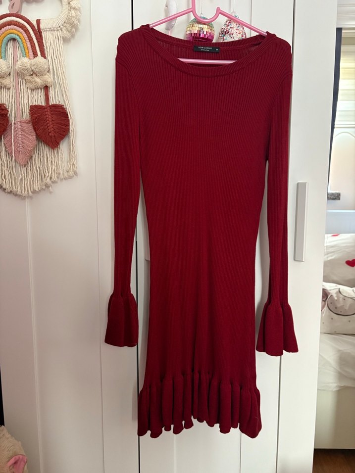 Bordo renkli, uzun kollu ve triko kumaşlı, volan detaylı dar kesim midi elbise, rahat ve şık bir görünüm sunar. Bir kere giyildi. Kusursuz M ve daha büyük bedenlere de olur çok esnek kumaşı ve tam diz altı boyu