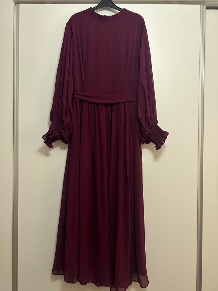 Bordo renkte, yüksek yakalı ve uzun kollu drapeli, bol kesim kadın elbisesi. Yumuşak sentetik kumaştan, klasik ve bohem tarzlara uygun, düğün için ideal.
