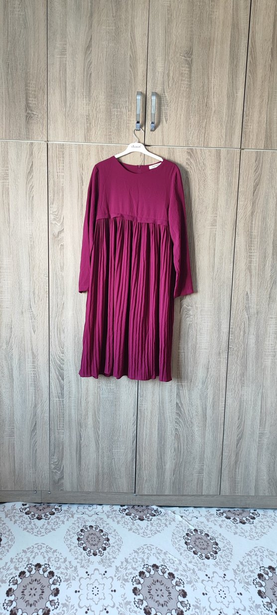 Bordo renkli, uzun kollu ve yuvarlak yakalı hamile tunik. Keten kumaştan, pileli ve bol kesimli, günlük kullanıma uygun sade ve retro tarzda.