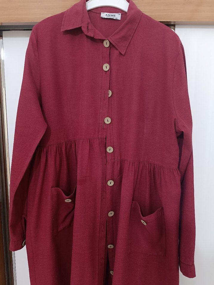 Bordo renkli, keten kumaştan yapılmış uzun kollu, düğmeli ve cepli bol kesim hamile tunik. Günlük kullanıma uygun, bohem tarzda rahat bir model. ASME etiketi mevcuttur.