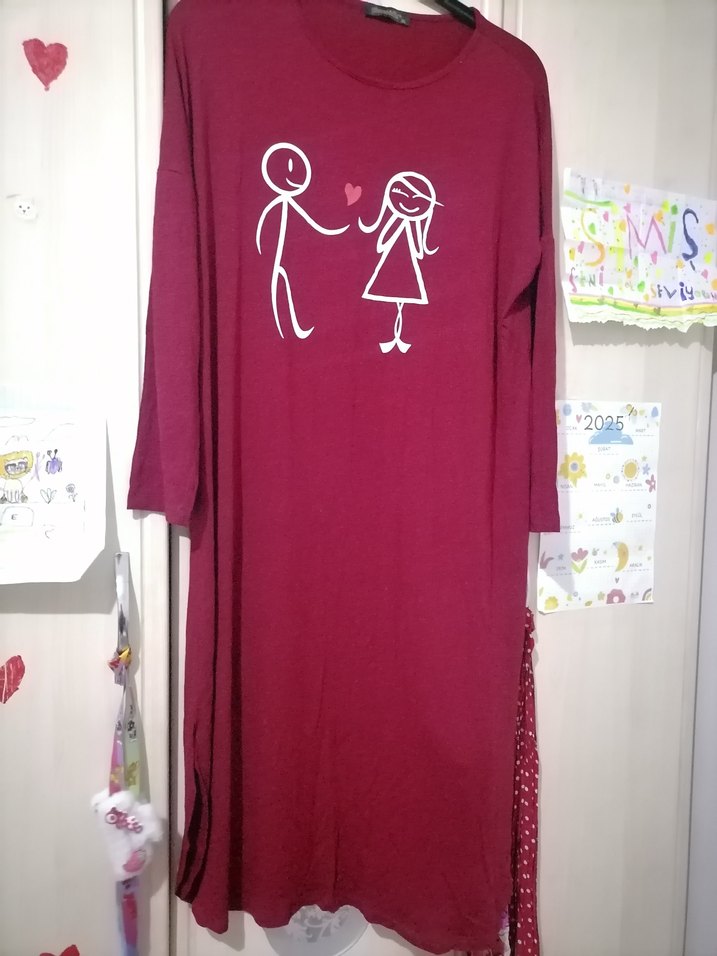 Bordo renkli, uzun kollu, yuvarlak yakalı ve bol kesim elbise ve tunik . Önünde renkli baskı deseni bulunur ve tam boy uzunluktadır. 42 44 46 bedenlere kadar uyumlu esnek bir kumaşı var