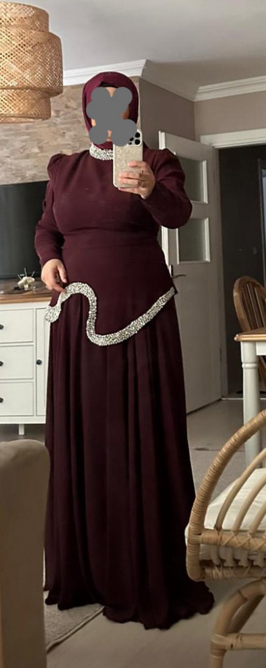Bordo renkte, uzun kollu ve yüksek yakalı, bol kesim uzun abiye elbise. 1 kez giyildi çok iyi durumda rahat kalıp 1.64 boy 75 kilo ileti giyildi