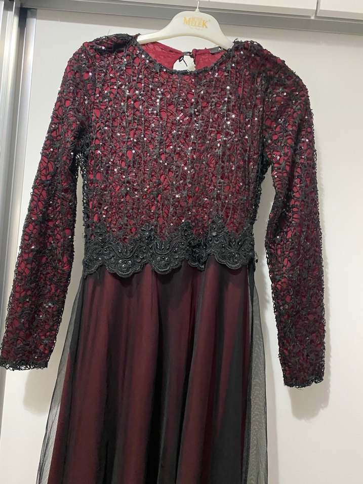 Bordo renkli, uzun kollu ve dantel detaylı bu uzun elbise, gotik tarzı yansıtır. Fitted kesimi ve crew yakası ile parti için uygundur. Boy uzunluğu 130 cm