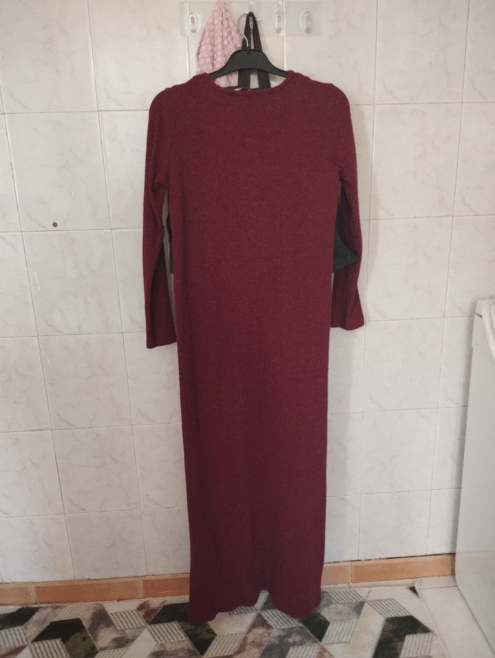 Bordo renk, uzun kollu ve bisiklet yaka olan bu uzun elbise, yumuşak sentetik kumaştan üretilmiş ve drapeli detaylarla rahat bir yapı sunar.