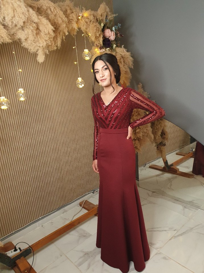 Bordo renkli, uzun kollu ve V yaka olan bu abiye elbise, drapeli ve desenli üst kısmıyla klasik şıklığı modern dokunuşla buluşturur. Fit kesimiyle düğünlere uygundur.