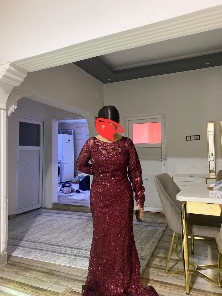 Bordo Uzun Kollu V Yaka Abiye Elbise sifir urun 42 bedwn