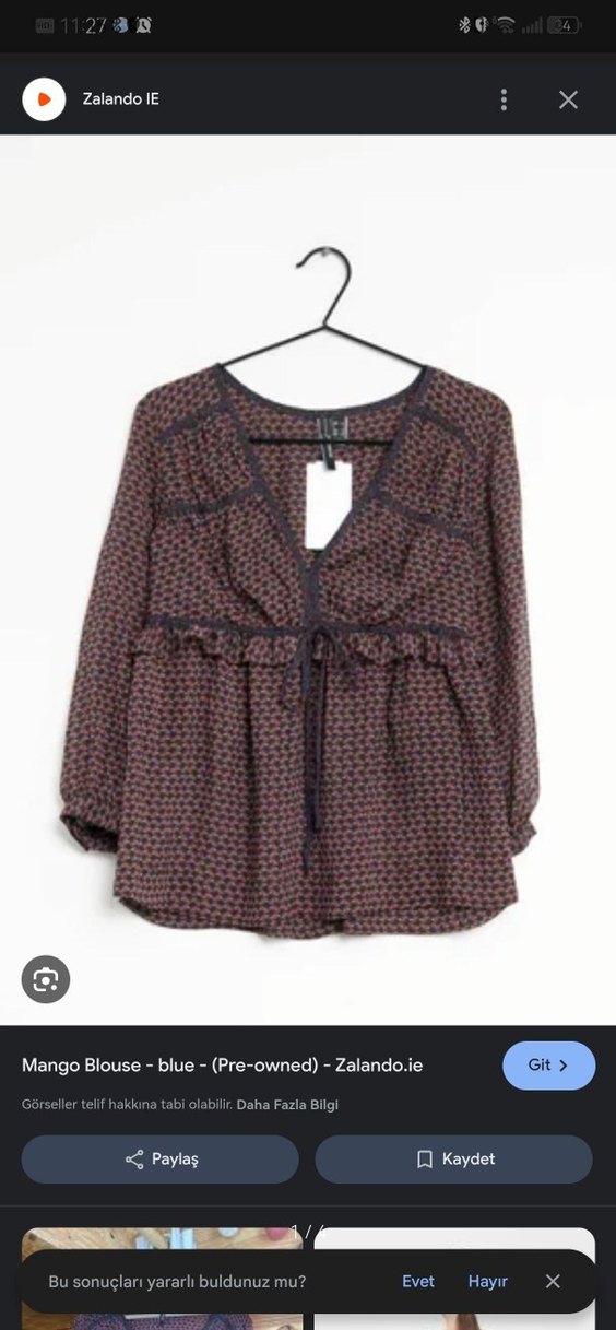 Bordo renkli, uzun kollu, V yaka ve bol kesim bluz. Bel bağlamalı ve koyu tonlarda batik desene sahip, yumuşak sentetik kumaştan üretilmiştir.
