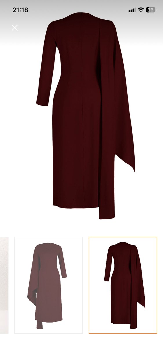 Bordo renkte, V yakalı ve uzun kollu bu uzun elbise, ipeksi kumaştan drapeli tasarıma sahiptir. Minimalist, çağdaş stil ve ofis kullanımı için uygundur.