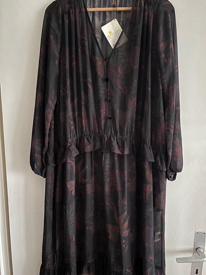 Bordo renkli, uzun kollu, V yaka ve bol kesim uzun elbise. Tie-dye desenli, fırfır detaylı, yumuşak sentetik kumaştan üretilmiştir. Romantik akşamlar için uygundur.