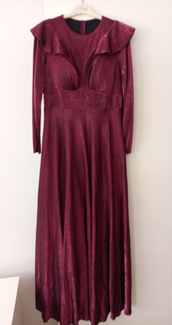 Bordo renginde, uzun kollu ve V yaka drapeli kadın elbisesi. İnce ve parlak kumaştan, modern klasik ve vintage tarzı bir arada sunar.
