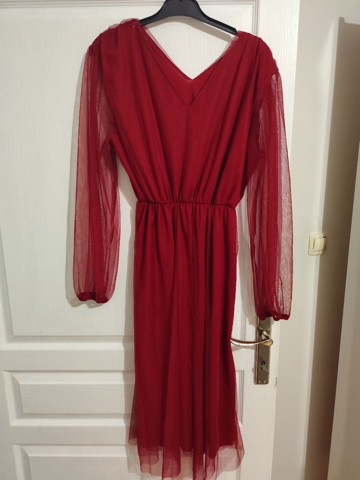 Bordo renkte, uzun kollu ve V yaka, drapeli, parlak ve ipeksi kumaştan yapılmış bol kesim vintage gotik tarzda kadın elbisesi. Romantik akşamlar için uygundur.