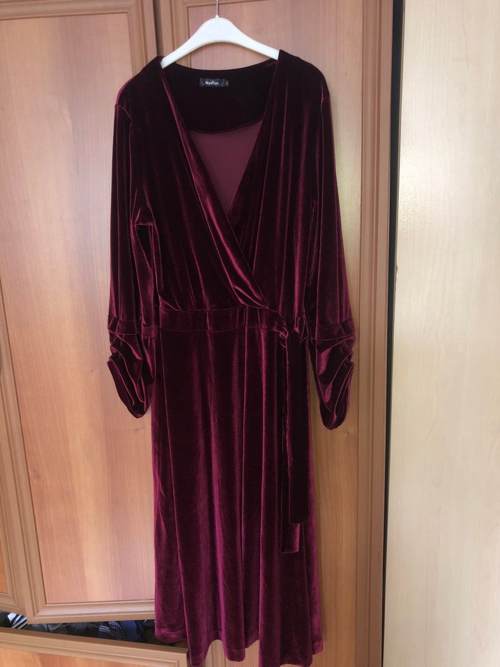 Bordo renkte, uzun kollu, V yaka, dökümlü ve bol kesim kadın elbisesi. Yumuşak ve parlak kumaşıyla romantik akşamlar için ideal bir seçim.