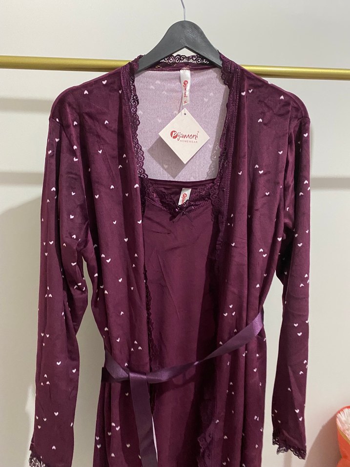 Bordo renkli, uzun kollu ve V yaka olan sabahlığı, bol kesime sahiptir. Baskılı deseni ve belden bağlama ipi bulunur. Yumuşak ve rahat kumaştan üretilmiştir.