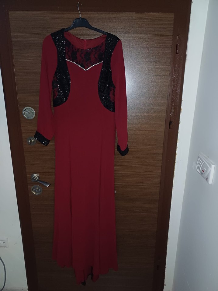 Bordo uzun kollu, V yakalı, drapeli ve siyah detaylı klasik kesim uzun elbisedir. Düğün için uygundur.