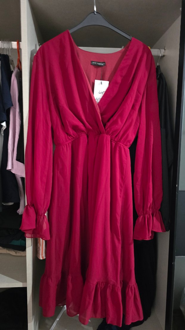 Bordo renkli, uzun kollu ve V yaka detaylı bu uzun elbise, dökümlü tasarımı ve bol kesimiyle dikkat çeker. Yumuşak sentetik kumaştan, bağlamalı desenlidir ve romantik buluşmalar için uygundur. ❤️