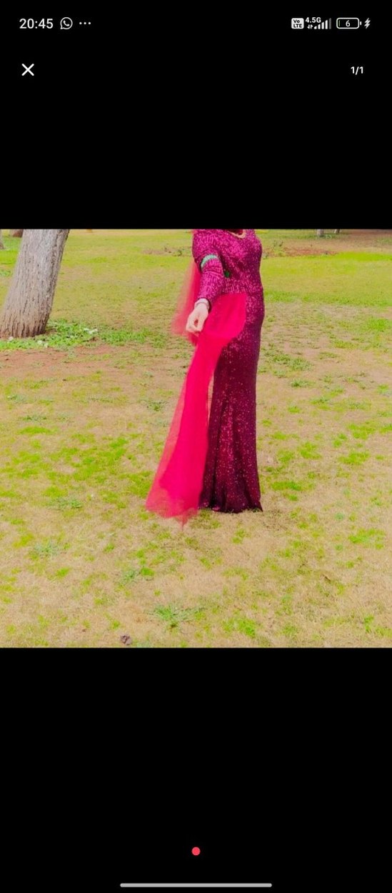 Bordo, uzun kollu ve V yakalı, parlak batik desenli, drapeli, dar kesim nişan elbisesi, düğünler için uygun.