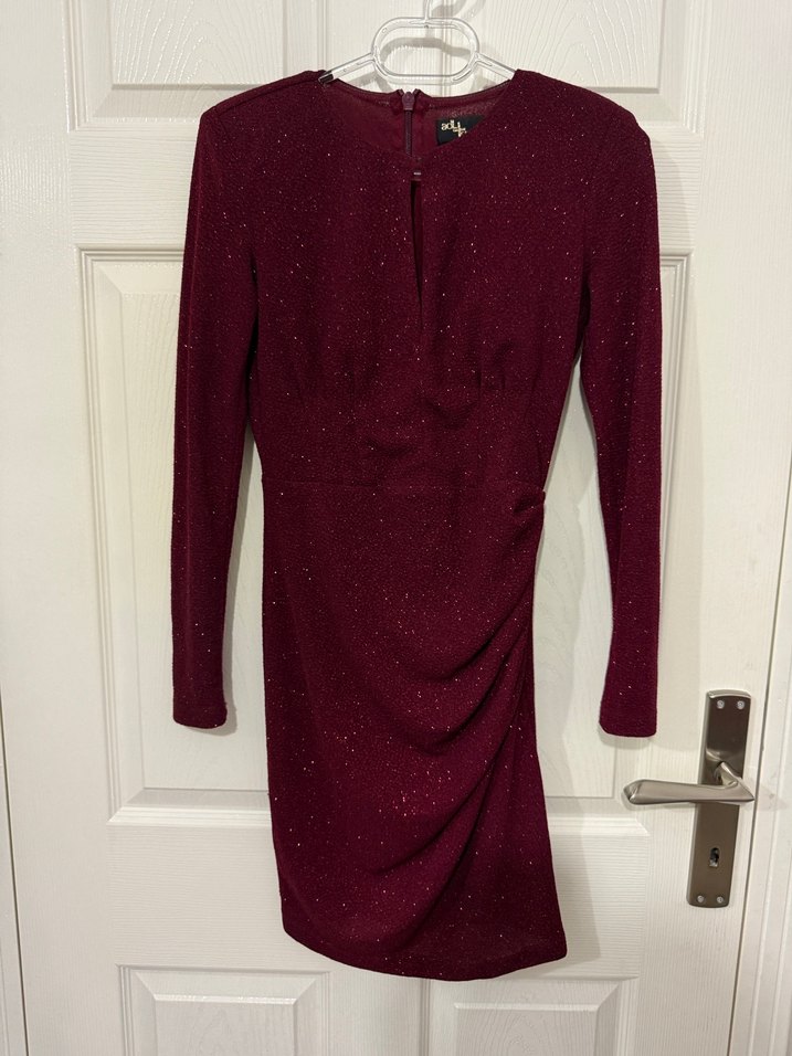 Bordo Uzun Kollu Vatkalı Drapeli Kadın Abiye Elbise