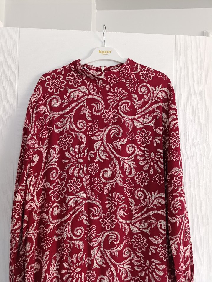 Bordo renk, uzun kollu, yüksek yakalı ve düğmeli vintage çiçek desenli bohem tarzda bol kesim kadın elbisesi.