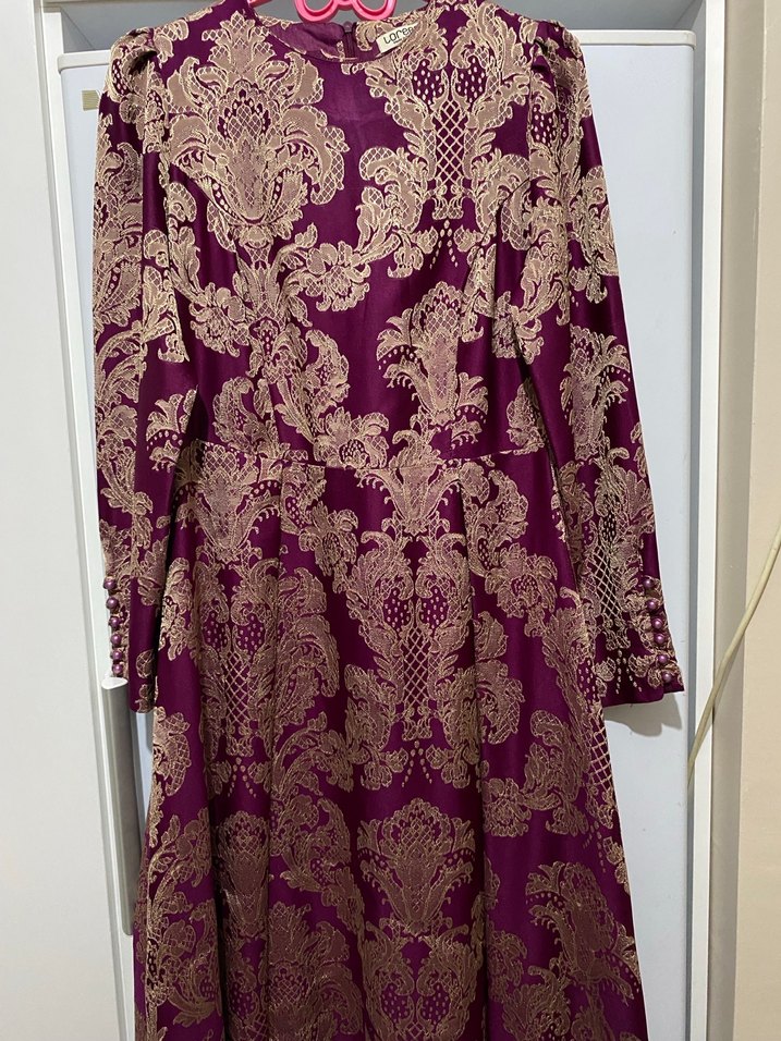 Bordo renkli, parlak desenli uzun elbise, yüksek yakalı ve uzun kolludur. Salaş kesimi ve drapeli tasarımıyla vintage klasik şıklık sunar.