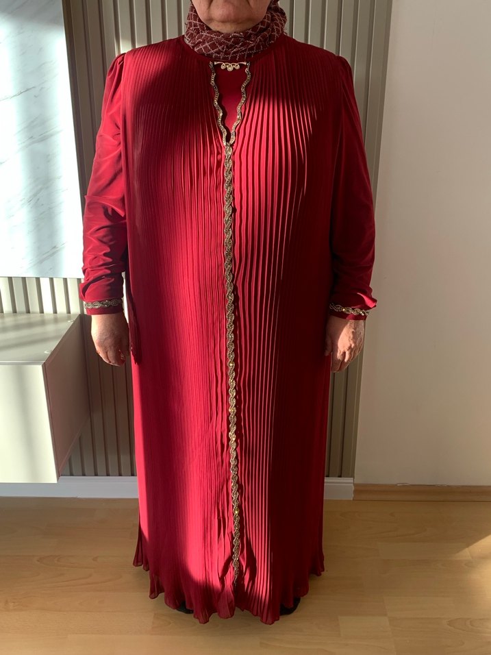 Bordo renkli, uzun kollu, bol kesim ve uzun boy vintage tarzda kadın elbisesi. Parlak ve desensiz kumaştan üretilmiştir.