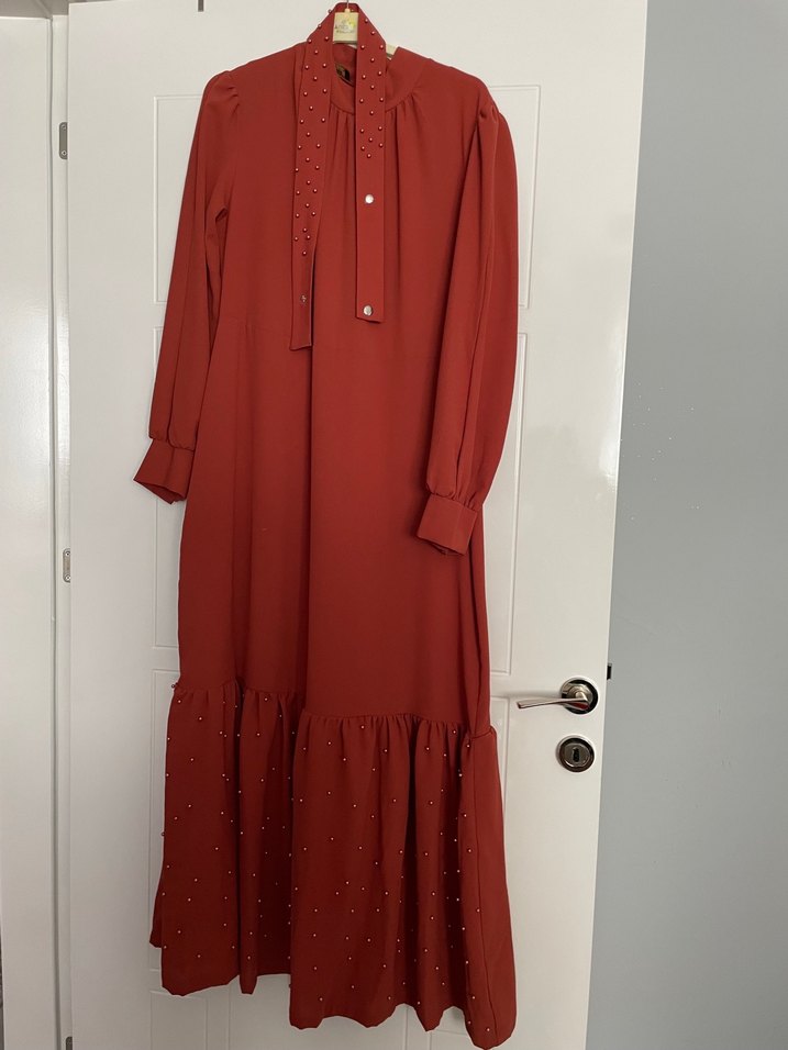 Bordo renkli, yüksek yakalı, bol kesim uzun elbise. Uzun kollu ve volan detaylı, parlak görünümlü bohem tarzda.