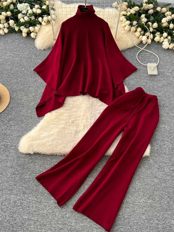ithal bordo renginde, yüksek yakalı ve uzun kollu, dökümlü üst ve regular fit pantolon içeren kadın takımı. Yumuşak ve sıcak kumaştan, günlük kullanıma uygun.