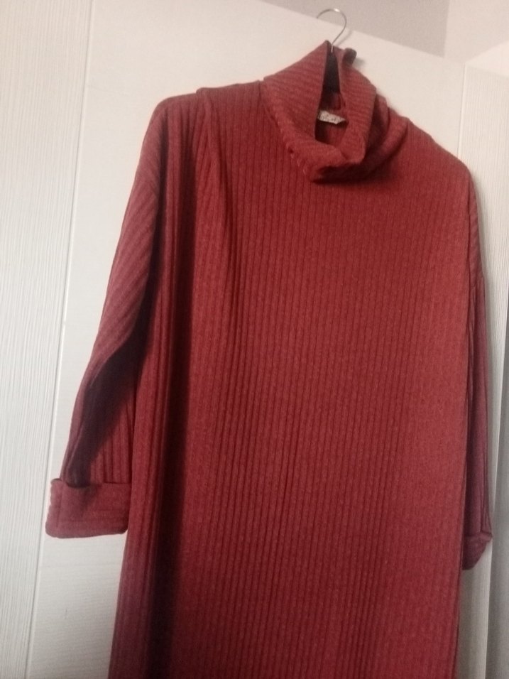 Bordo renk, yüksek yakalı, uzun kollu, bol kesim kadın trikosudur. Örgü keten kumaştan yapılmıştır, günlük kullanıma uygundur.