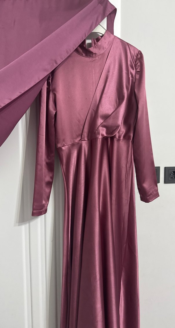 Bordo Uzun Kollu Yüksek Yakalı Abiye Elbise şal dahildir