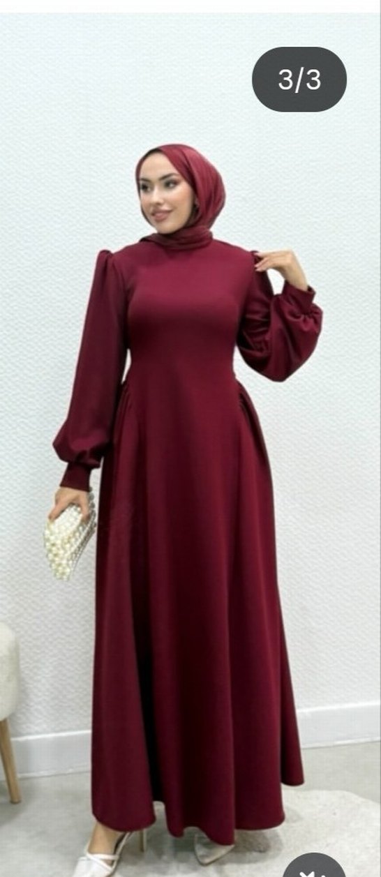 Bordo renkli, uzun kollu ve yüksek yakalı abiye elbise. Salaş kesim ve parlak, desensiz kumaşıyla düğünler için uygun.