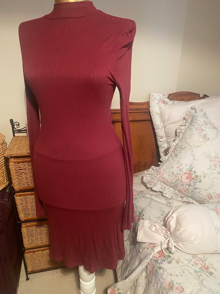 Bordo Uzun Kollu Yüksek Yakalı Elbise