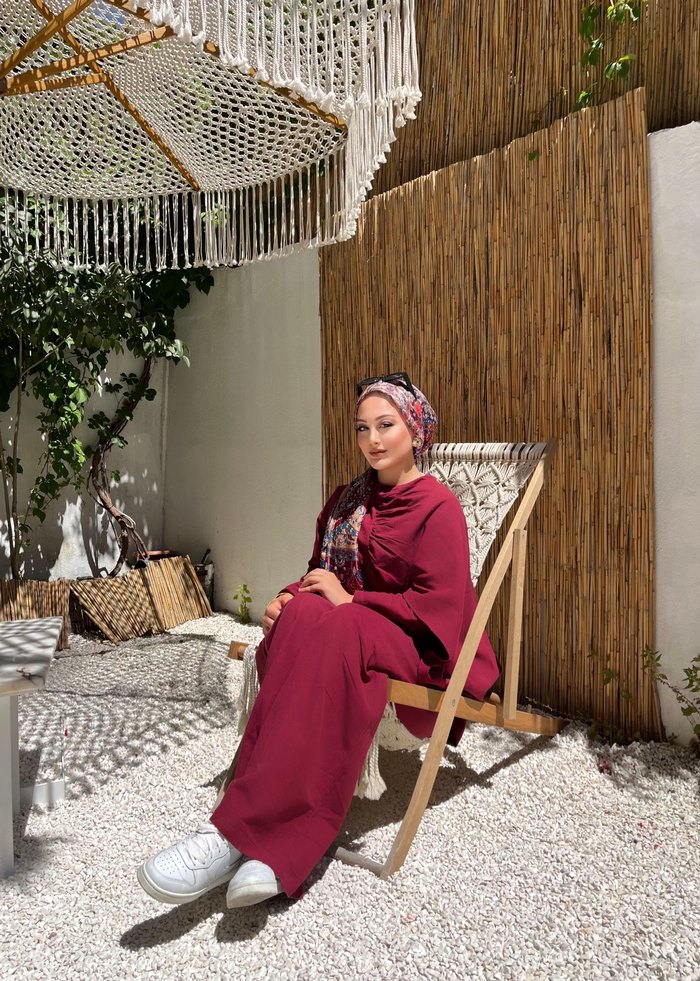 Bordo renkli, yüksek yakalı ve uzun kollu takım İpeksi kumaştan, drapeli detaylarla sade ve modest tarzda, günlük kullanıma uygun.
