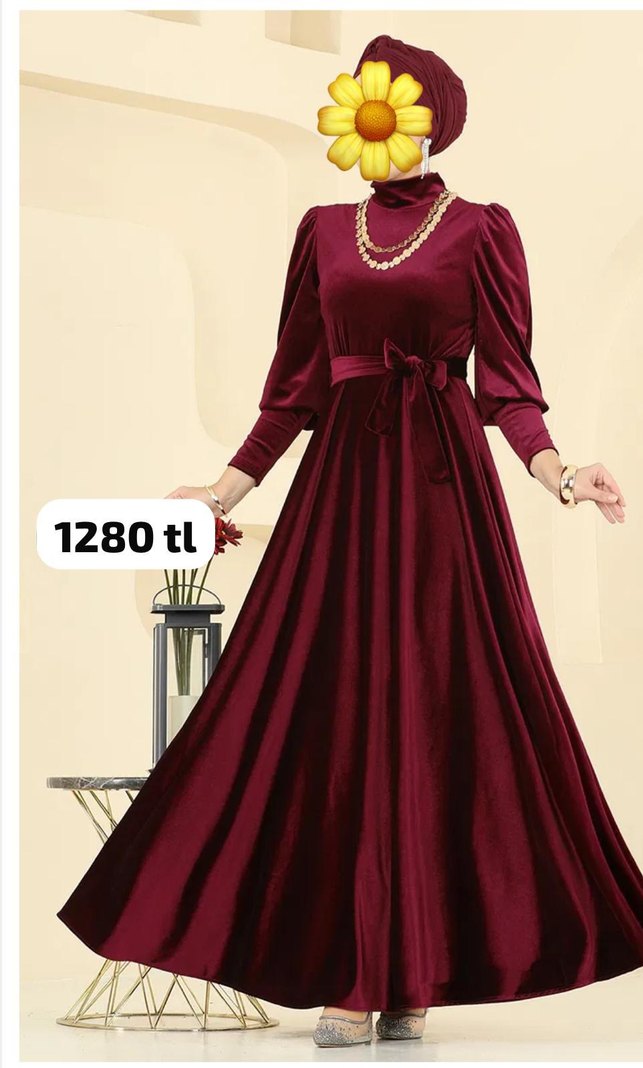 Bordo renkte, yüksek yakalı ve uzun kollu, bol kesim kadın abiye. Dökümlü tasarımı ve desenli modeli ile düğünler için uygun. Fiyatı 1280 TL.