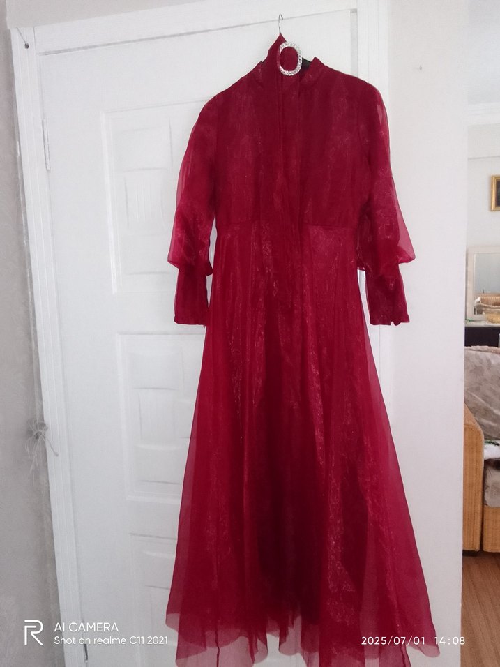 Uzun, bordo renkli bu elbise yüksek yakalı ve uzun kolludur. Bol ve drapeli kesimiyle, parlak kumaşı vintage bohem tarzını yansıtır. Düğün için uygundur.