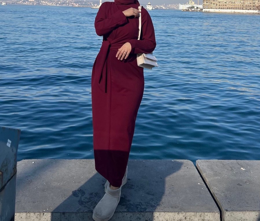 Bordo renkli, uzun kollu ve yüksek yakalı bu uzun elbise, dökümlü detaylara ve rahat kesime sahiptir. Yumuşak ve sıcak kumaştan üretilmiştir, sade ve mütevazı tarz için uygundur.