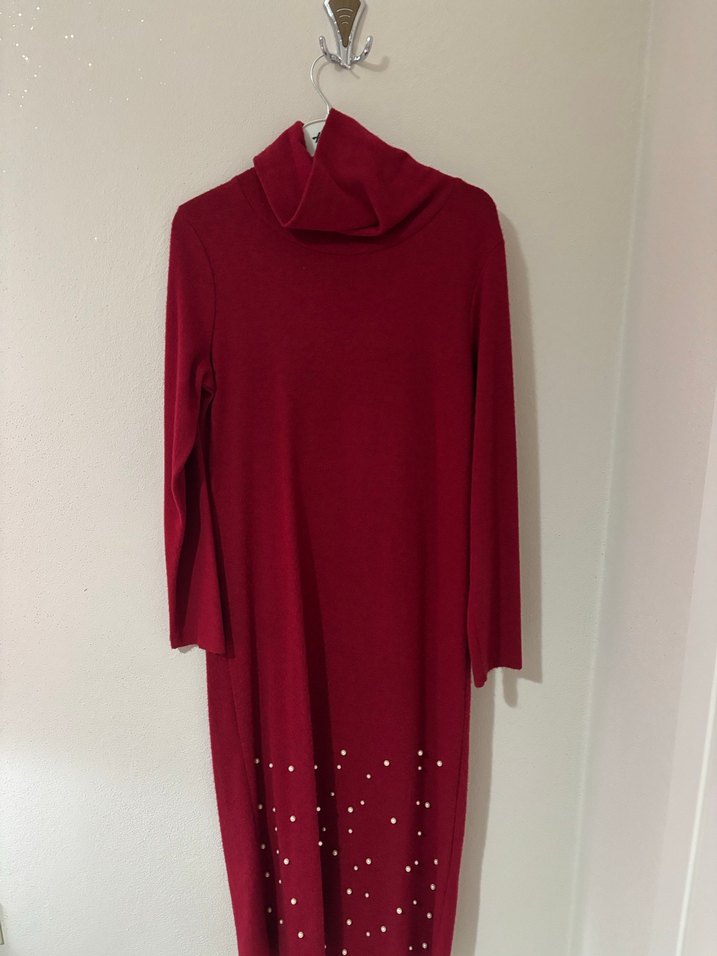 Bordo uzun kollu, yüksek yakalı, vücuda oturan triko elbise. Yumuşak ve sıcak kumaştan, drapeli tasarıma sahip. Günlük kullanıma uygun. ❄️