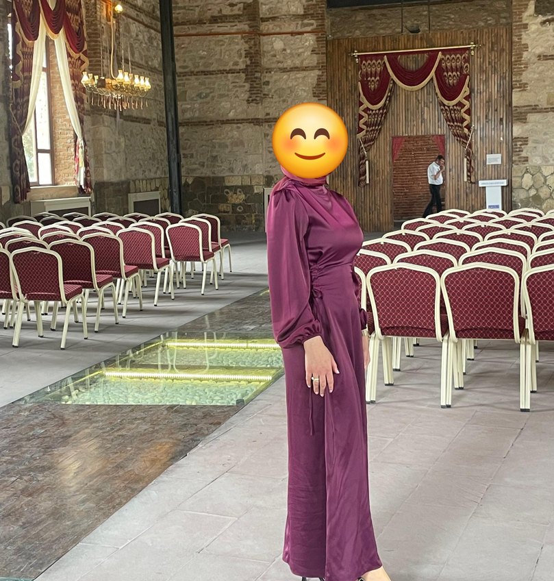 Bordo renginde, uzun kollu ve yüksek yakalı, ipeksi dokuda drapeli uzun ve vücuda oturan elbise. Romantik akşamlar için uygundur. pazarlık vardır