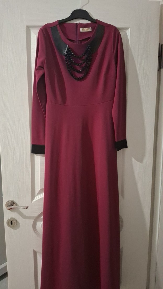 Bordo uzun kollu, yuvarlak yakalı kadın elbisesi, zincir detaylı yaka ve siyah manşetlerle klasik bir görünüme sahiptir. Ofis için uygundur.
