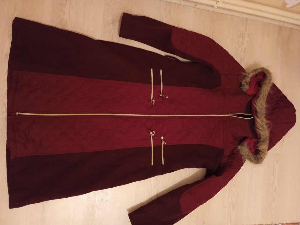 Bordo renkli, sentetik kumaştan uzun mont, notched yaka ve uzun kollu. Fermuarlı ve cepli, rahat ve bohem tarzda günlük kullanıma uygun.