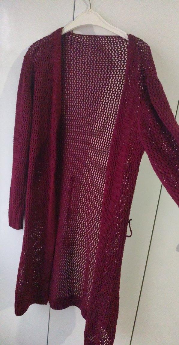 Bordo uzun örgü hırka, bol kesim ve yaka detayına sahip. Rahat ve bohem tarzıyla günlük kullanıma uygundur.