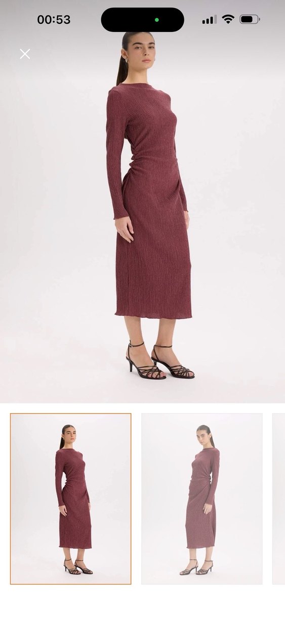Bordo uzun elbise, kayık yaka ve ince askılı, yumuşak sentetik kumaştan piliseli tasarıma sahip. Ofis için uygun, rahat kesim.