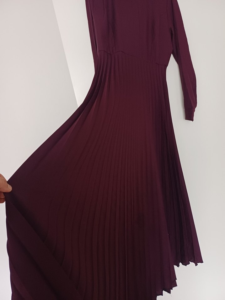 Bordo renkli, uzun ve piliseli etekli, yüksek yakalı ve uzun kollu, ince kesim, ipeksi kumaştan kadın elbisesi. Düğünler için uygundur.