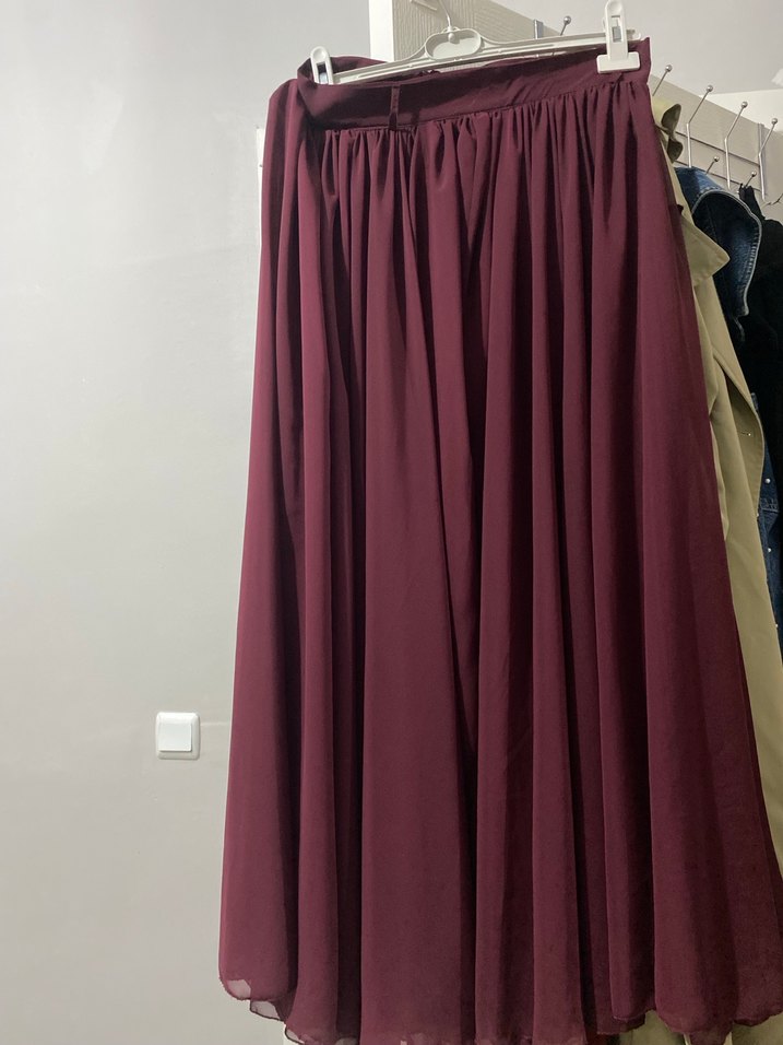 Bordo renkte, uzun ve salaş kesimli, drapeli tasarıma sahip sentetik kumaştan yapılmış etek. Minimalist tarzıyla ofis kullanımı için uygundur. Sıfır ürün bedeni olmadığı için satıyorum