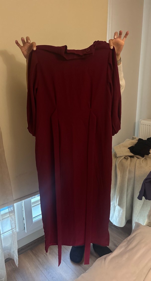 Bordo renkte, salaş kesim ve drapeli tasarıma sahip uzun elbise. İpek gibi yumuşak kumaştan, uzun kollu ve tek renk. Romantik akşamlar için ideal bohem stil. Balgamlı belden elbise