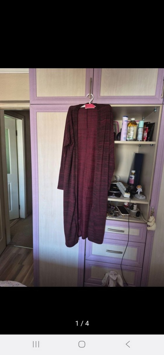 Bordo renkli, uzun ve salaş kesimli hırka. Uzun kollu, drapeli ve yakası kesik detaylıdır. Yumuşak sentetik kumaştan, bağlama desenlidir. Günlük rahat kullanıma uygundur. Az giyildi temiz ve sağlamdır