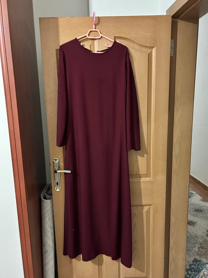 Bordo renkli, uzun ve salaş kesimli bu kadın elbisesi, drapeli detaylara ve yuvarlak yaka sahiptir. Uzun kollu ve ipeksi dokuludur, sade ve mütevazı tarzı yansıtır.