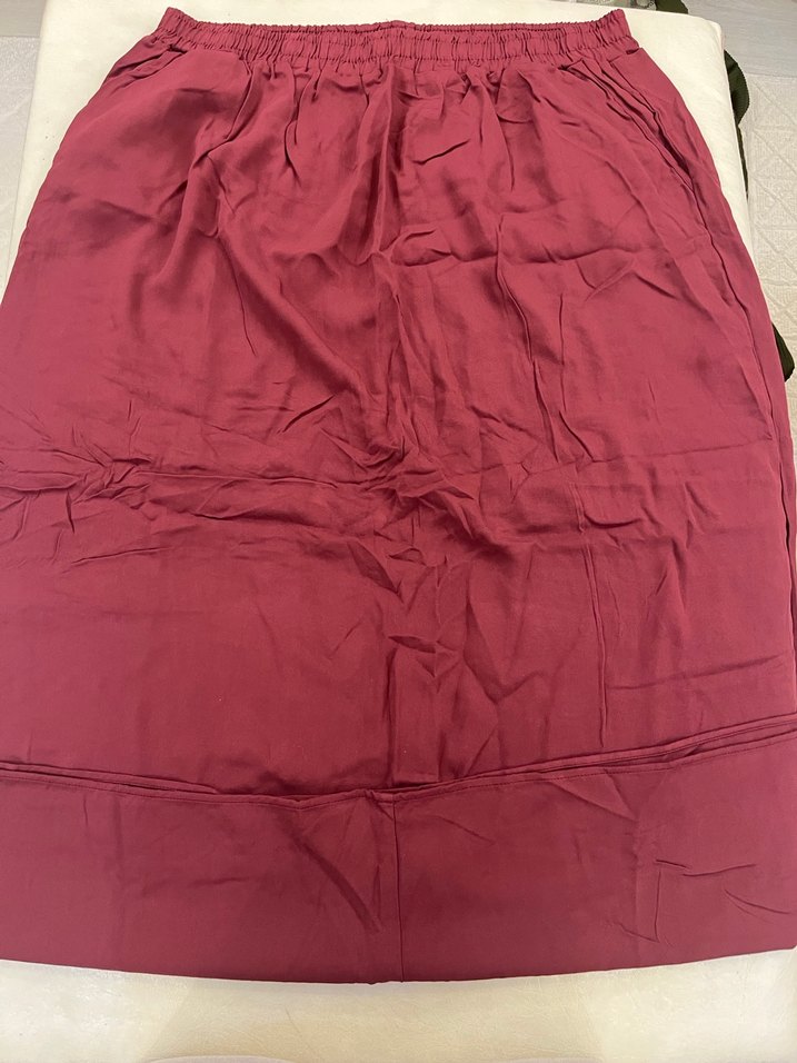 Bordo renkli, uzun ve salaş kesimli kadın eteği, ipeksi kumaş ve drapeli tasarıma sahiptir. Minimalist bohem tarzı için parlak ve sade görünümlüdür.
