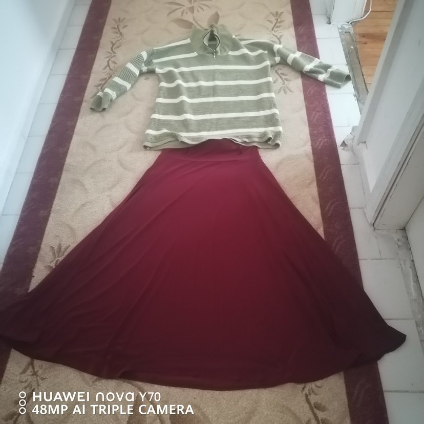 Bordo uzun, salaş kesim kadın eteği, yumuşak sentetik kumaştan, drapeli tasarıma sahip. Günlük rahat, normcore stil için uygundur.