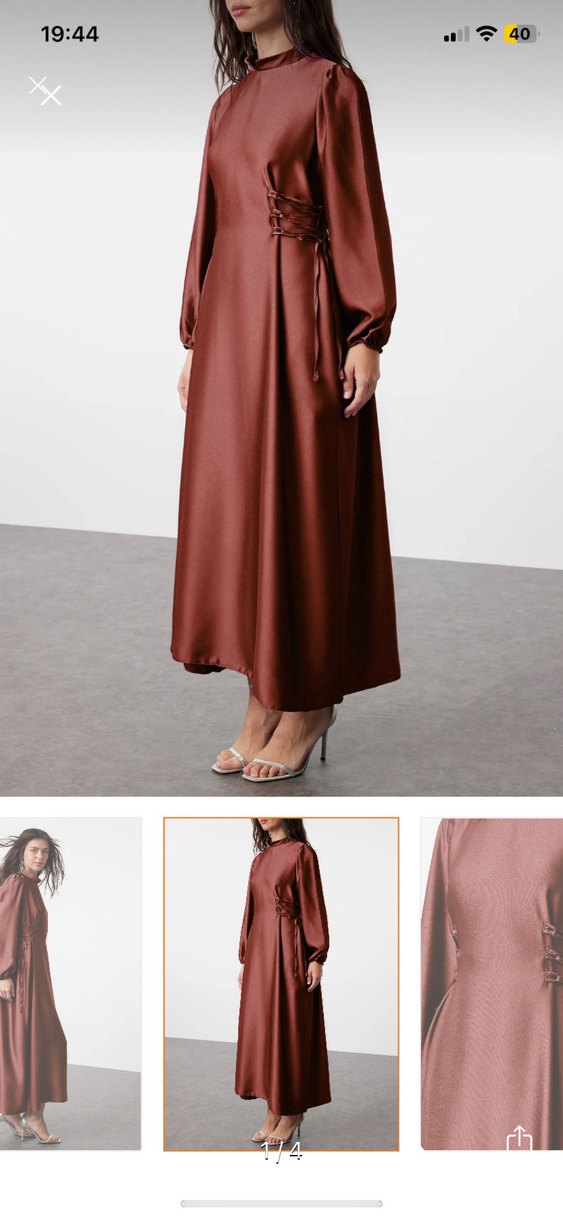 Kahverengi, parlak saten kumaştan uzun ve bol kesim elbise. Drapeli tasarım, askılı kollar ve tekne yaka ile modern ve sade ofis stiline uygun.