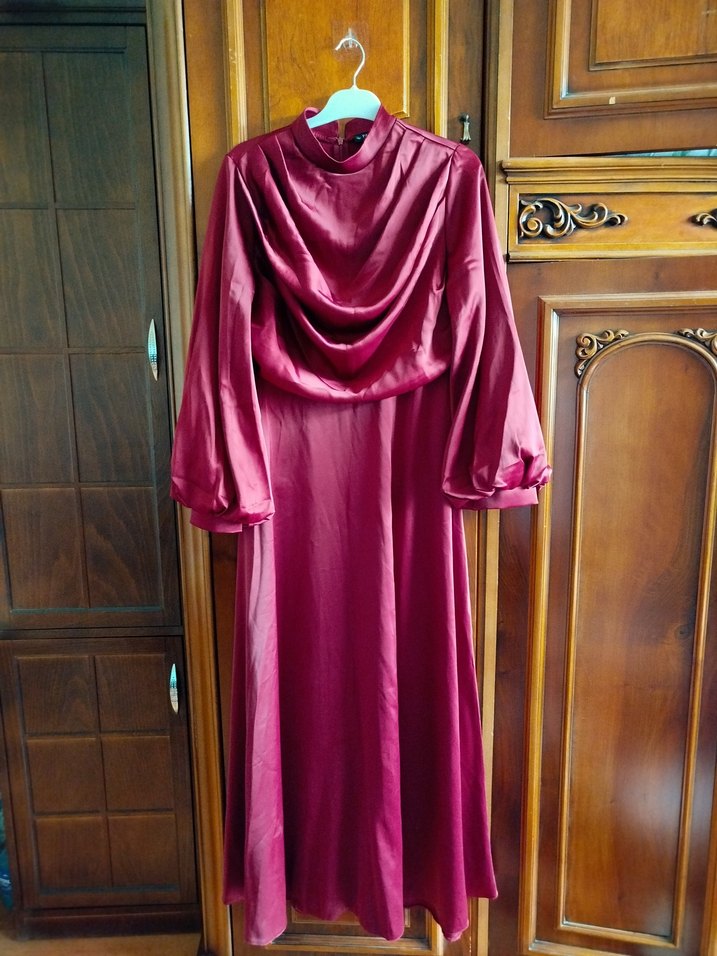 Bordo renkli, saten ve parlak kumaştan yapılmış uzun elbise. Yüksek yakalı, uzun kollu ve drapeli, bol kesim vintage tarzı elbise.